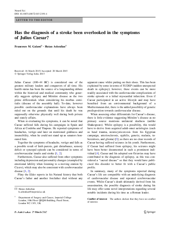 Pdf Has The Diagnosis Of A Stroke Been Overlooked In The Symptoms Of Julius Caesar Francesco Maria Galassi Academia Edu
